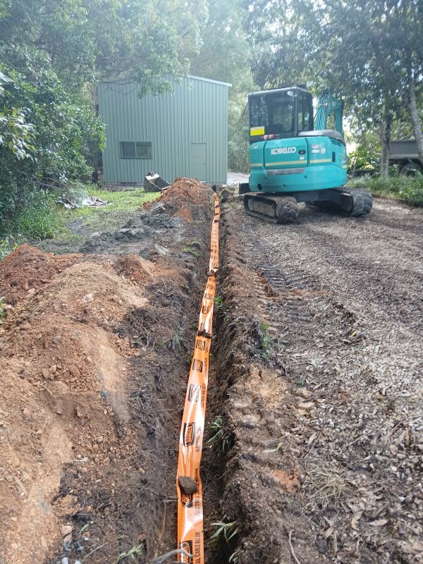 Running underground sub-mains involves the installation of mechanically protected cabling through conduit, which must be trenched at the correct depth and backfilled appropriately. On rural properties, this often necessitates collaboration with an earthworks contractor for the trenching process. The electrical connections at both ends, including those at the main switchboard and the shed sub-board, must be executed by licensed electrical professionals. We manage the entire process, overseeing earthworks, so you only need to communicate with one point of contact rather than juggling multiple trades, making the project more streamlined and efficient.